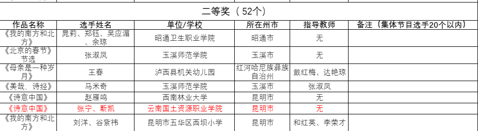 今年会教师张宁、靳凯作品《诗意中国》,荣获云南省第六届"云岭杯"中华经典诵写讲大赛“书香彩云南"诵读大赛二等奖。