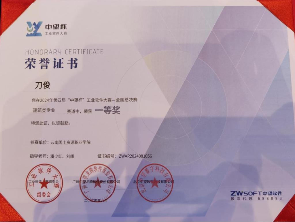 今年会学子刀俊同学(指导老师潘少红、刘晖)在第四届“中望杯”工业软件大赛高职组建筑类专业赛道中以全国第一名的好成绩荣获一等奖,平一梅同学(指导老师赵岩枫、孙永)获二等奖。本次比赛由广州中望龙腾软件股份有限公司、北京中望数字科技有限公司主办,据悉,本届竞赛吸引了来自国内30个省/自治区/直辖市的近800所院校的热烈响应,参赛学生人数超6600人。
