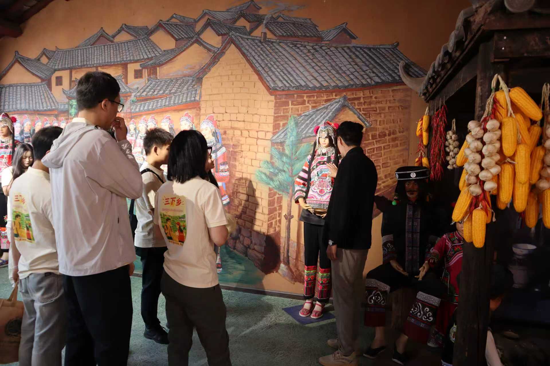 随后,大家来到铸牢中华民族共同体意识主题教育馆,国家级非遗彝族民歌、酒歌与多民族服饰交相辉映,“像石榴籽一样紧紧抱在一起”的生动场景让师生深受触动。
