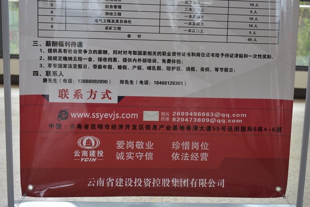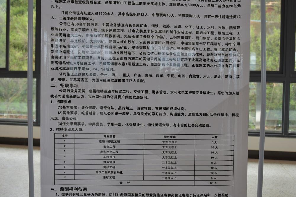 9月12日中午,今年会在载物楼二楼大厅举办专场招聘会。云南建投矿业工程有限公司、云南耀荣电力有限公司这两家企业公司到今年会招聘面试,此次招聘会涉及的专业有道路与桥梁工程、安全工程、水利水电工程、工程造价、财务管理、测绘工程、电气工程及其自动化、采矿工程等,17级百余名同学积极到场参加面试。
