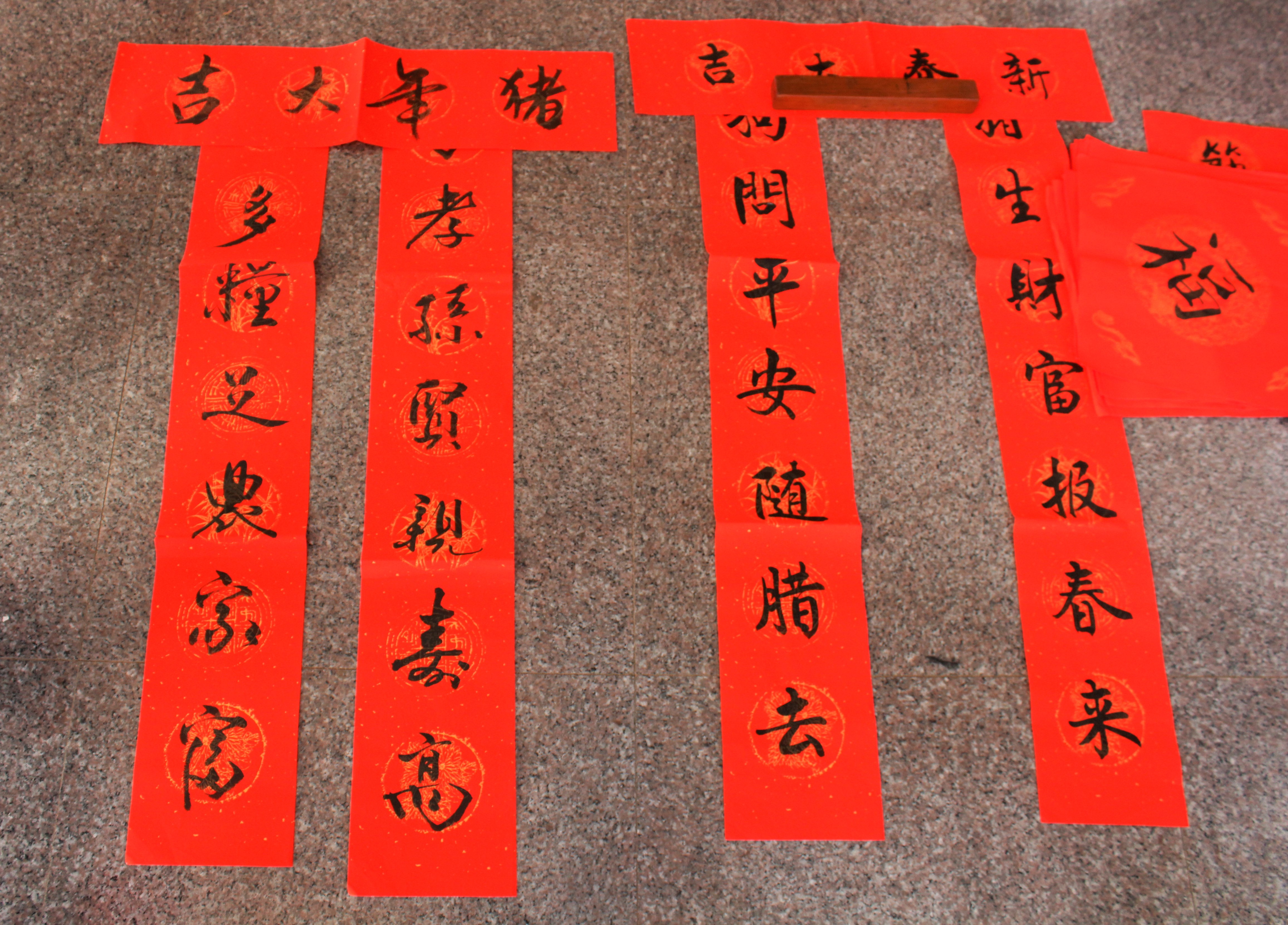 活动现场,谭老师、罗老师和夏雨书苑学生代表挥毫泼墨,一笔一画,笔力雄健,一幅幅喜庆大红春联不一会儿就展现在人们眼前。顿时,吸引了很多教师和同学驻足求联,“私人订制”对联,气氛红火,一副副带有新年气息的春联,一句句美好愿望的祝福,短短两小时内送出近百副春联和福字,当老师和同学们拿到充满新年祝福的春联时,纷纷表示感谢。让老师和同学们体会到书法的艺术美和中华传统民俗文化的魅力。