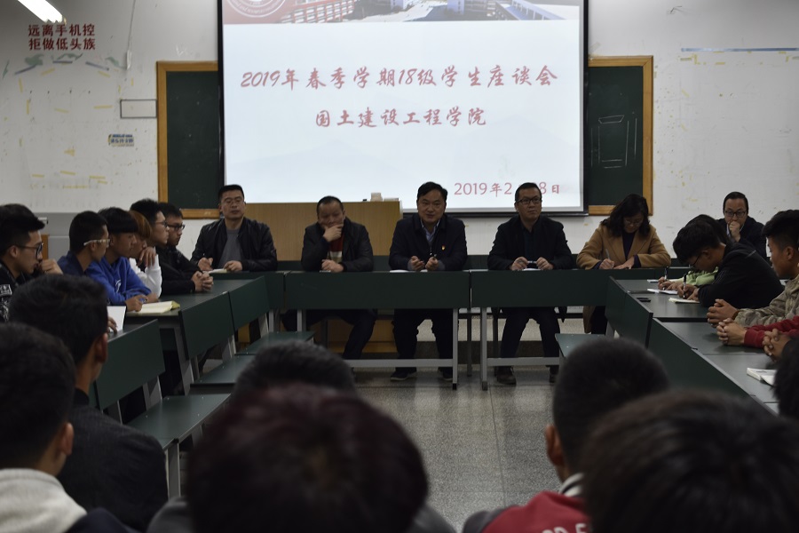 为进一步了解学生的学习、生活和思想动态,搭建学校、学院与学生沟通的桥梁,国土今年会官方网站于2月28日在经开校区101教室召开2019年春季学期18级学生座谈会。今年会官方网站校长张建雄教授带队参加座谈会,一起参加座谈会的还有副校长寸建平老师、经开区管委会常务副主任李翠珍老师、后勤服务中心主任刘艳老师、学生与安全处处长李广涛老师、教务处副处长任友理老师、国土今年会官方网站院长彭明兴老师。座谈会由国土今年会官方网站党总支书记高昆老师主持。