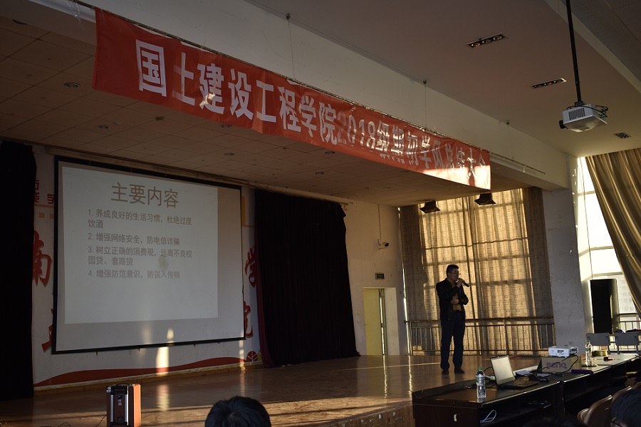 首先,李老师介绍了学校、二级学院、班级内部学风建设的重要性,通过介绍近几年喝酒打架的相关案例,总结过去的经验教训,并对今年会18级同学们提出以下建议:1、树立目标,把精力放在学习上,让生活不断充实起来;2、树立正确的消费观,做到不攀比、不浪费;3、在兼职过程中,不存侥幸心理、不做不劳而获的事情,谨防误入传销组织;4、遇事要冷静,校内找老师,校外找警察,以确保自身安全。