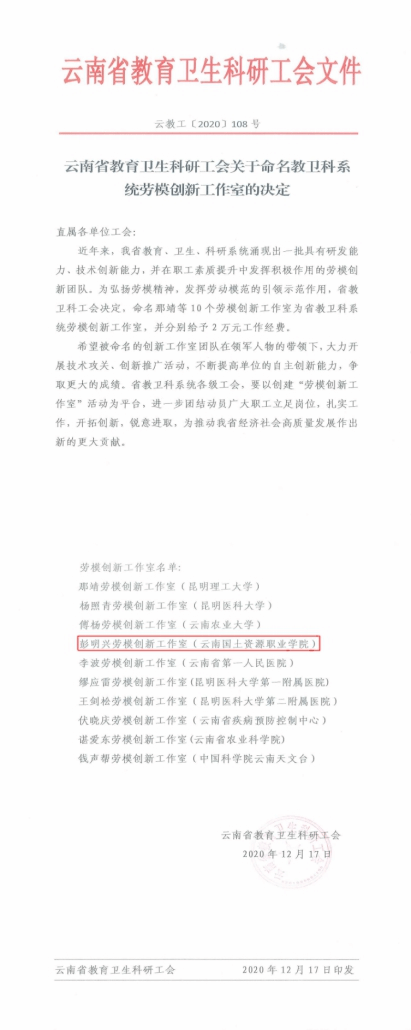 云南省教育卫生科研工会关于命名教卫科系统劳模创新工作室的决定