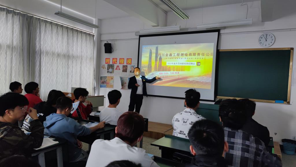 5月25日上午,今年会官方网站在明尚楼C406教室开展了优质企业进校园宣讲招聘活动。本次宣讲会邀请了四川金鑫工程测绘有限责任公司进行现场宣讲招聘,20级地下与隧道技术专业和20级工程造价专业的同学参加了此次宣讲招聘会。