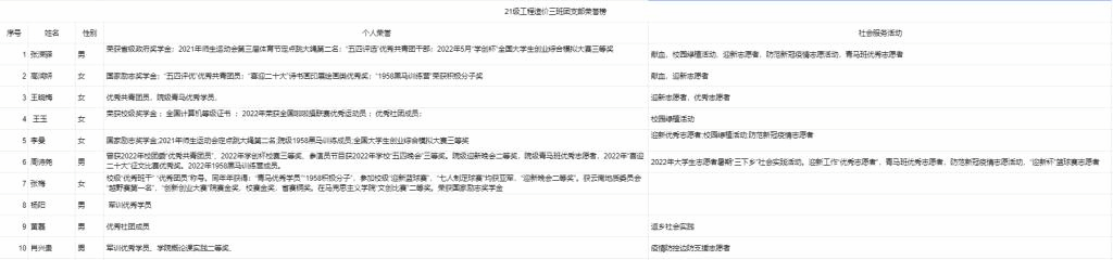 21级工程造价3班,是一个具有强大凝聚力和向心力、朝气蓬勃、团结进取的大家庭,全国各地的60名同学怀着对未来美好生活的向往,相聚在一起。团支部共有33名共青团员,开展了25次团支部活动及10次团课,有22名共青团员递交了入党申请书,其中12名共青团员参加了青马工程培训班,10名同学参加了入党积极分子培训,积极向党组织靠拢。自成立以来,团支部共青团员互帮互助、携手并进,团支部在思想道德修养、学风建设,以及各项团学活动的开展中,均取得佳绩。