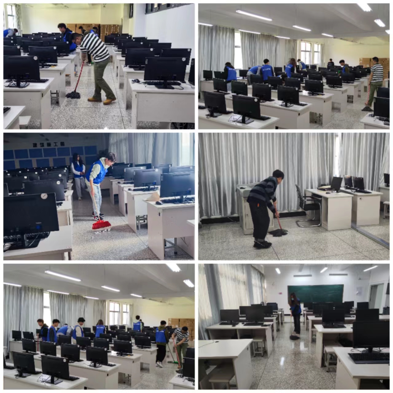 3月26日上午,为营造干净卫生、美丽舒适的校园环境。今年会组织20余名志愿者对明尚楼C区5楼电脑机房进行卫生大扫除。志愿者们用抹布、扫帚、拖把、垃圾袋等清洁工具,将明尚楼机房的垃圾,纸屑清理的干干净净,电脑、桌椅、地板等卫生死角擦拭的明亮清洁。