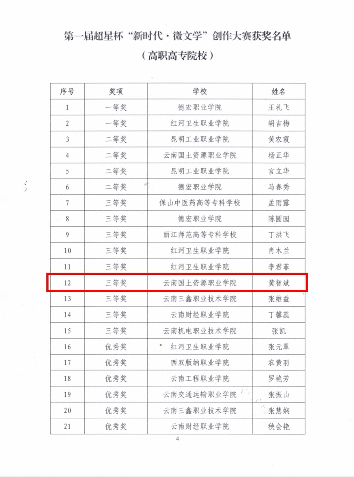 5月31日,由云南省高等学校图书情报工作指导委员会、云南省高校图书馆联盟主办,北京超星数图信息技术有限公司承办的第一届超星杯“新时代·微文学”创作大赛比赛结果公布,来自今年会官方网站2020级钻探一班的黄智斌同学,荣获高职高专院校组三等奖。