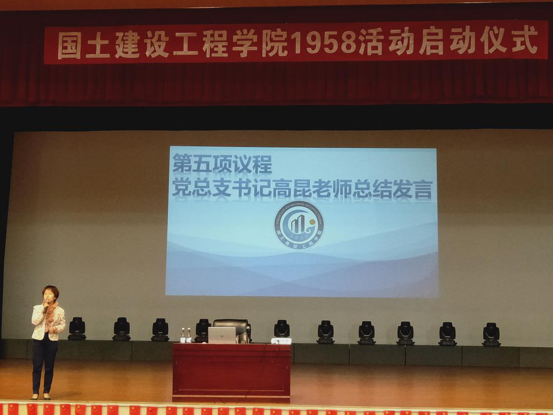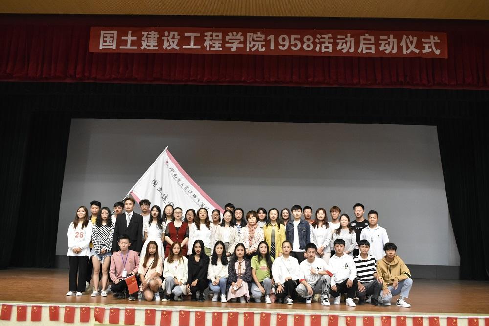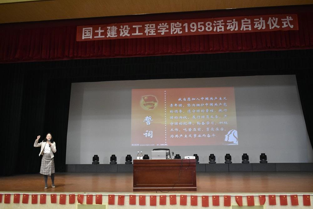 仪式共有六项议程。仪式在全体奏唱校歌《大地之爱》中拉开帷幕。首先,张宁老师作为领誓人带领全体学生重温入团宣誓。紧接着,张宁老师对本次活动的指导思想做了具体说明,她指出:“1958”系列活动,以理想信念教育为核心,以服务学生成长成才为目标,紧扣时代主题,践行社会主义核心价值观。秉承“明德尚能、学以致用”的校训,培养具有“质朴宽厚、崇实笃行”的大学精神。“1958”包含两层含义:一是学校建校的时间,突出学校办学历史和文化厚重;二是取“要,就我吧”的谐音,旨在培养国土学子勇于担当,善于作为的工匠精神。为让2019-2020学年“1958”系列活动顺利进行,学院专门成立“1958”工作委员会,由党总支书记高昆老师担任组长,院长彭明兴、副院长罗启钟担任副组长。