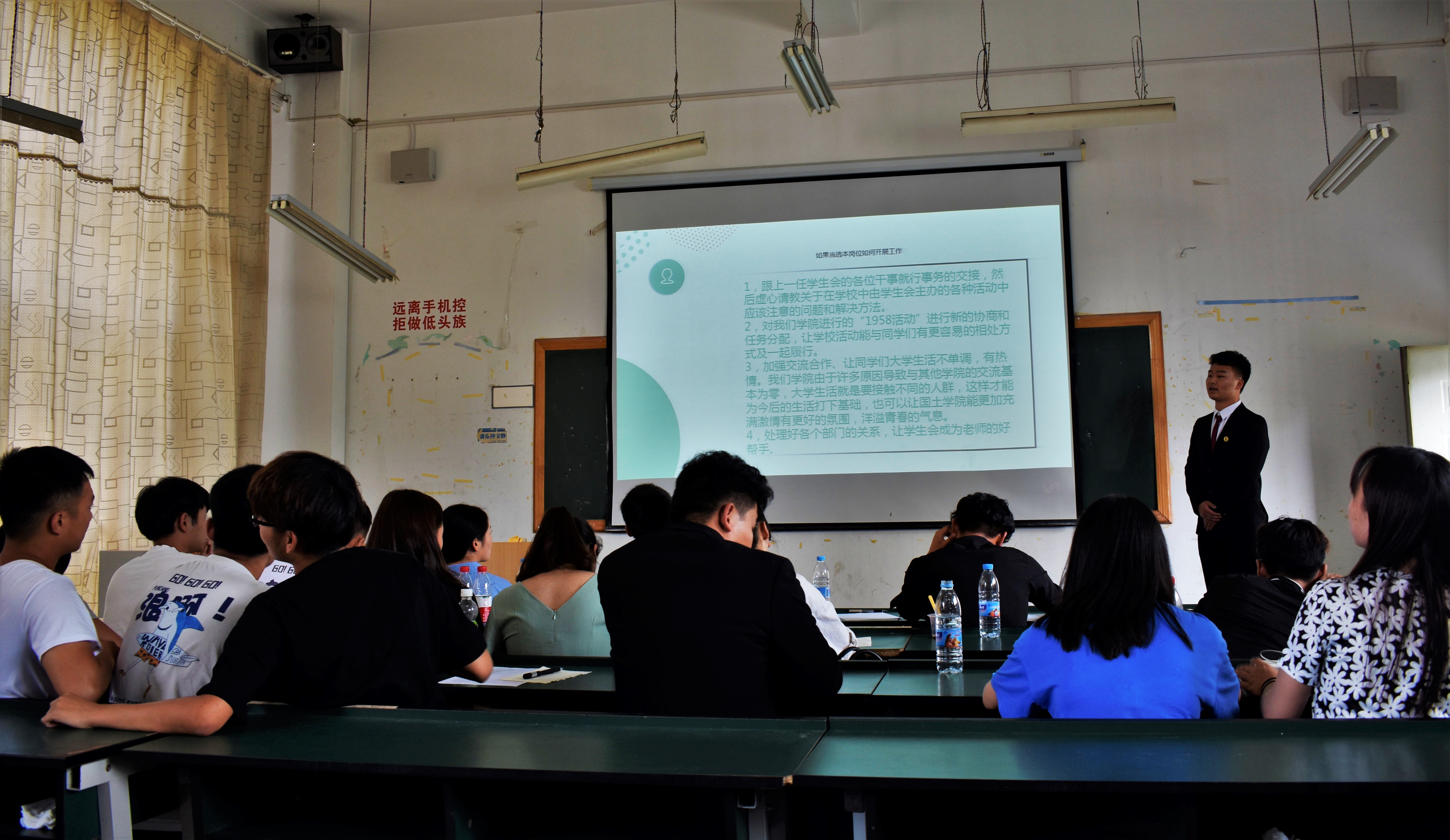 第二轮竞选环节于2019年6月14日13:30在经开校区101教室进行。杨寿鑫老师、霍冬芳老师、庞玲玲老师、17级学生会全体干部以及18级参加竞选的各位同学参加换届选举。竞选分为竞选演讲以及现场评委提问。首先17级学生会副主席陶宁发言。紧接着是各位竞选同学竞聘演讲、以往工作汇报及现场问答。评委的提问虽然尖刁,可同学们依旧自信从容地回答每一个问题。最后,杨老师作总结发言,杨老师充分肯定了同学们的付出,希望大家在接下来的工作中精诚团结、明确职责,提升自己、服务同学,营造良好风气, 推动学院学生工作再上新台阶。